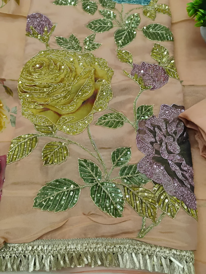🌹✨ Pastel Garden Embroidered Suit Fabric Set ✨🌹 Elegance in Bloom Wrap yourself in floral finesse with this stunning suit fabric set, a graceful celebration of pastel hues and exquisite embroidery. Featuring a soft blush base, this ensemble blooms with hand-embroidered 3D roses in vibrant shades of blue, lavender, yellow, and lilac, highlighted with sequin detailing and lush green leaves. 💫 Fabric Details: Top Fabric: Soft organza-style base with multicolor floral embroidery and fine sequin work Bottom Fabric: Coordinating plain dyed fabric in blush pink Dupatta: Matching floral printed organza with shimmering accents 🌸 Design Highlights: Embellished floral motifs with bead and sequin accents Intricate metallic silver tassel lace on edges for added glamour Dreamy garden-inspired color palette on a pastel canvas 🎀 Perfect For: Daytime celebrations Garden parties or summer festivities Elegant casual or semi-formal ethnic looks