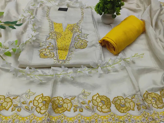 🌼 Sunlit Elegance Embroidered Suit Set 🌼 Glow in graceful charm with this radiant unstitched suit set, designed in a soft ivory-beige silk blend and adorned with intricate yellow floral embroidery. A perfect fusion of subtle luxury and festive flair, this ensemble is crafted to make your ethnic style shine. ✨ Fabric: Premium Silk Blend with Subtle Sheen 💛 Embroidery: Handcrafted floral design in yellow, gold, and silver threads with shimmering accents 👗 Kurta Design: Classic rounded neckline with deep V-cut, featuring a richly embroidered panel and sparkling sequin highlights 🌟 Bottom/Dupatta: Solid mustard yellow fabric to mix and match as desired 🎀 Occasion: Ideal for day functions, poojas, casual festive gatherings, and elegant ethnic wear Whether you stitch it into a straight-cut kurta or a flowy anarkali, this set brings sunshine to your wardrobe with its timeless color palette and refined craftsmanship.